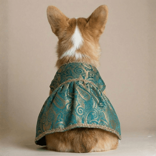 Give your pet a graceful ethnic look with this beautifully designed dog dress. Featuring a rich teal color with intricate traditional patterns and fine detailing, this outfit is perfect for weddings, festivals, celebrations, and special photoshoots.