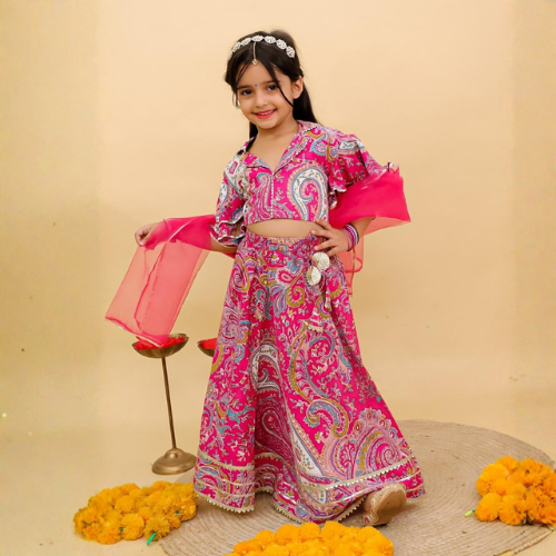 Multicolor Floral Lehenga Choli Set Vibrant sky blue base with bold multicolor floral print, bell sleeves choli with gota border, flared lehenga with golden lace hem, and matching pink dupatta — perfect for festivals & puja celebrations.