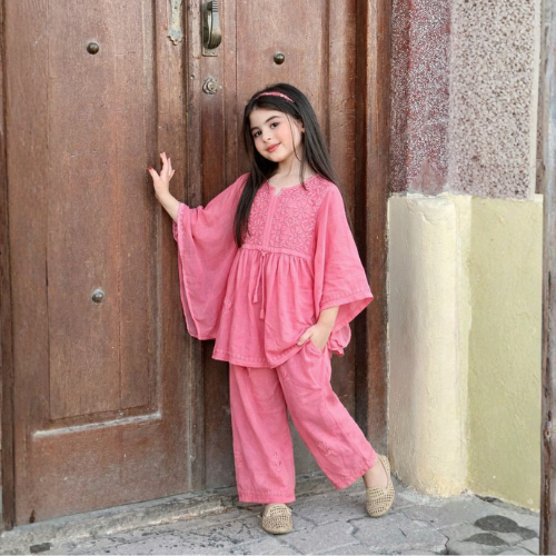 The Noorika Brocade Pink and Green Lehanga is a beautifully coordinated two-piece outfit showcasing a tailored pink top with subtle embellishments and a voluminous, textured green skirt. This classic festive look is seamlessly tied together by matching golden sequin trims along the neckline, sleeves, and flared hem.