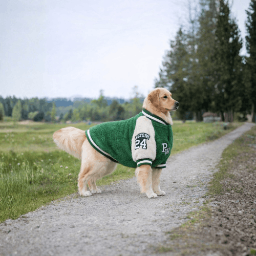Give your pet a cool, sporty look with this green varsity-style dog jacket. Designed with a classic athletic vibe, contrast sleeves, and a number patch detail, this jacket is perfect for outdoor walks, casual outings, and cool-weather wear.
