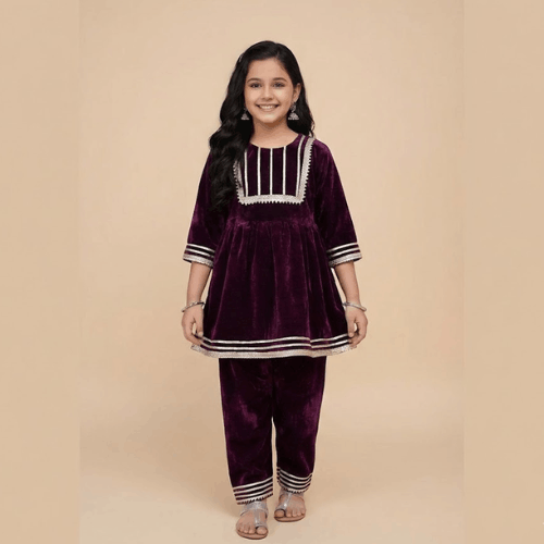 Elegant wine-purple velvet ethnic set featuring a flared kurti with embroidered yoke and matching palazzo pants. Soft, rich fabric offers comfort with a festive touch—perfect for weddings and special occasions.