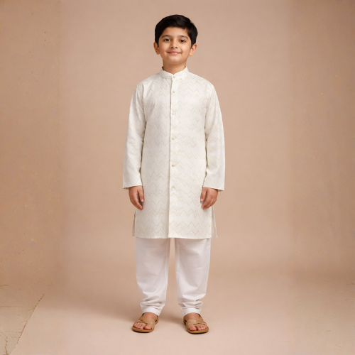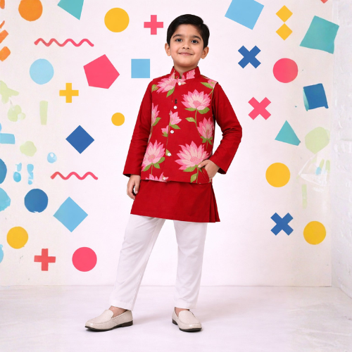 A rich solid maroon full-sleeve kurta paired with crisp white pajama, topped with a bold Nehru jacket featuring oversized pink lotus blooms and green leaves on a maroon base — a vibrant and eye-catching festive outfit perfect for weddings, pujas, and special celebrations.