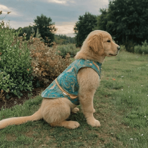 Give your furry friend a charming ethnic look with this beautifully designed dog vest. Featuring a rich teal-blue color with traditional-inspired prints and fine detailing, this vest is perfect for festive occasions, casual outings, and adorable photoshoots.